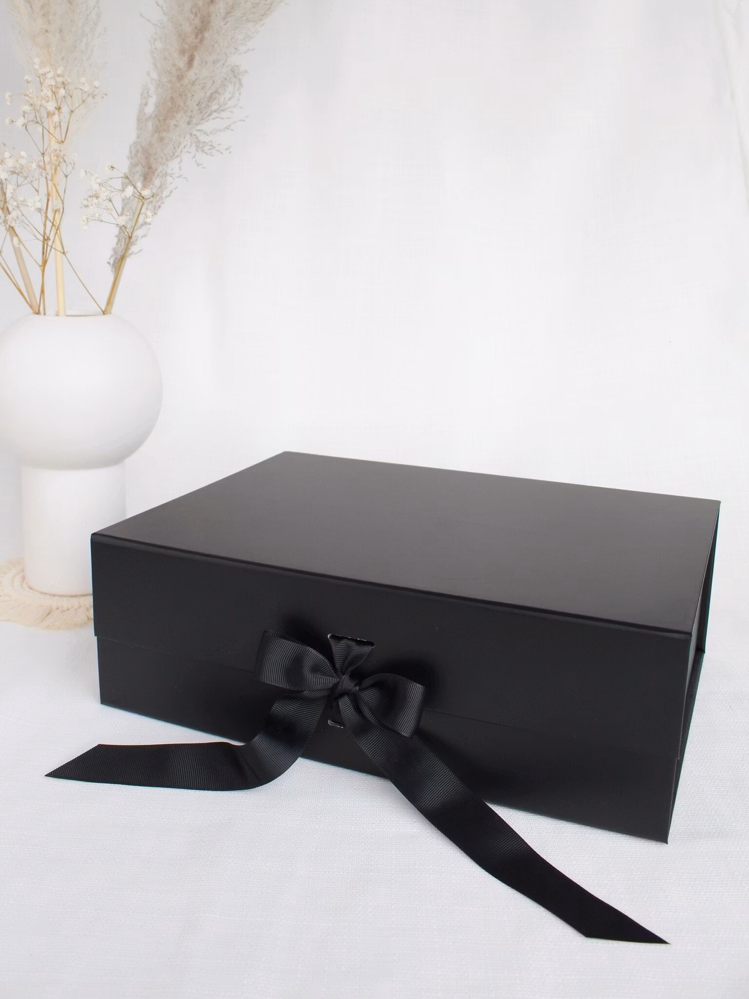 Stor presentbox med personlig text. Boxen stängs med magnetiskt lock och låses med ett ribbat satinband i matchande färg. Satinband i matchande färg ingår, men vill du byta ut mot annat färg kan du köpa till ett satinband här.