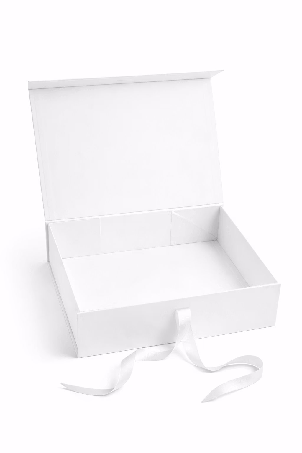 Boxen stängs med ett satinband i samma färg som boxen. Det går att byta ut satinbandet till annan färg. Våra satinband hittar du här.
