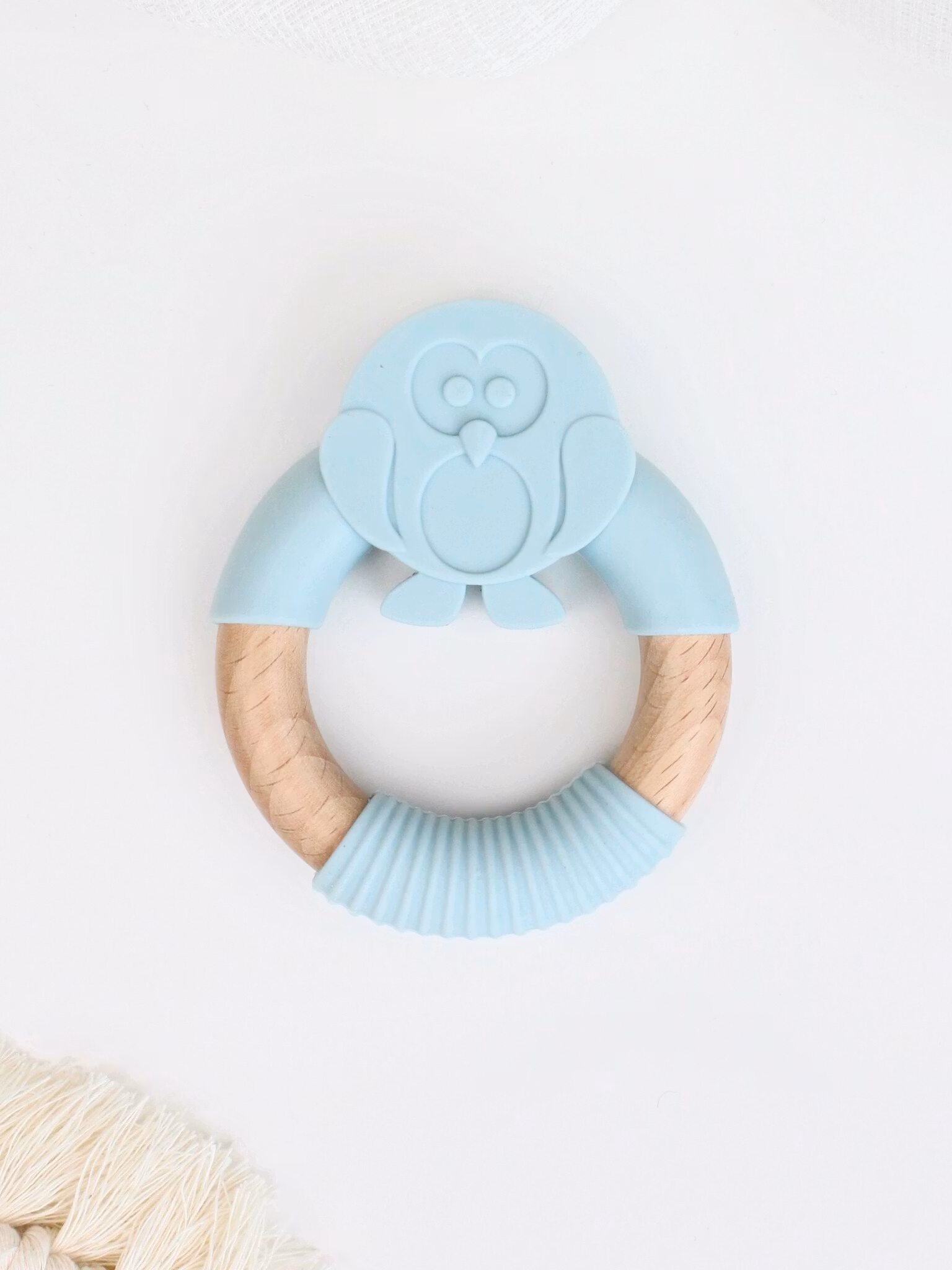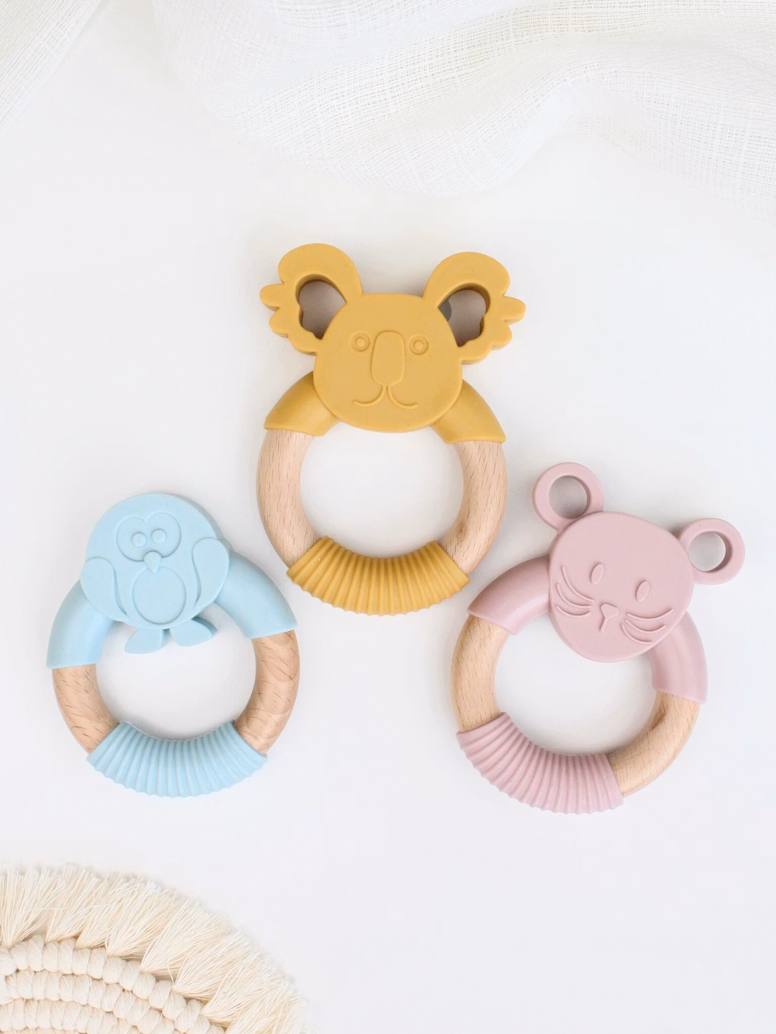 Bitleksak i silikon och FSC-märkt trä från bok. Silikonen är livsmedelsgodkänd och helt fri från plast.