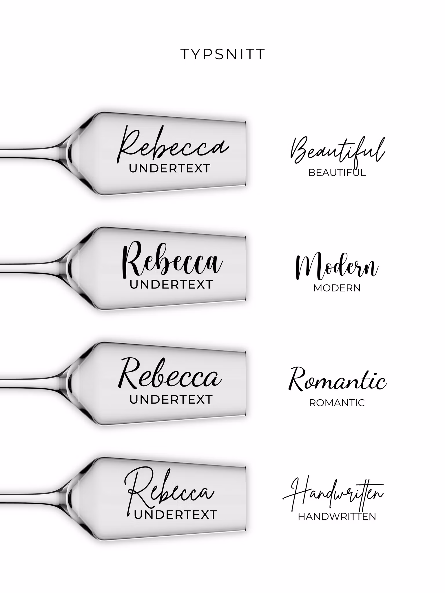 Text ingår i valfritt typsnitt. Förslagsvis ett namntryck och en titel t ex. Birthday Girl, Bridesmaid, Maid Of Honor, Bride To Be. Undertext trycks i i versaler och i vårt standardtypsnitt. Undertexten är valfri, lämnas rutan tom trycks enbart namnet.
