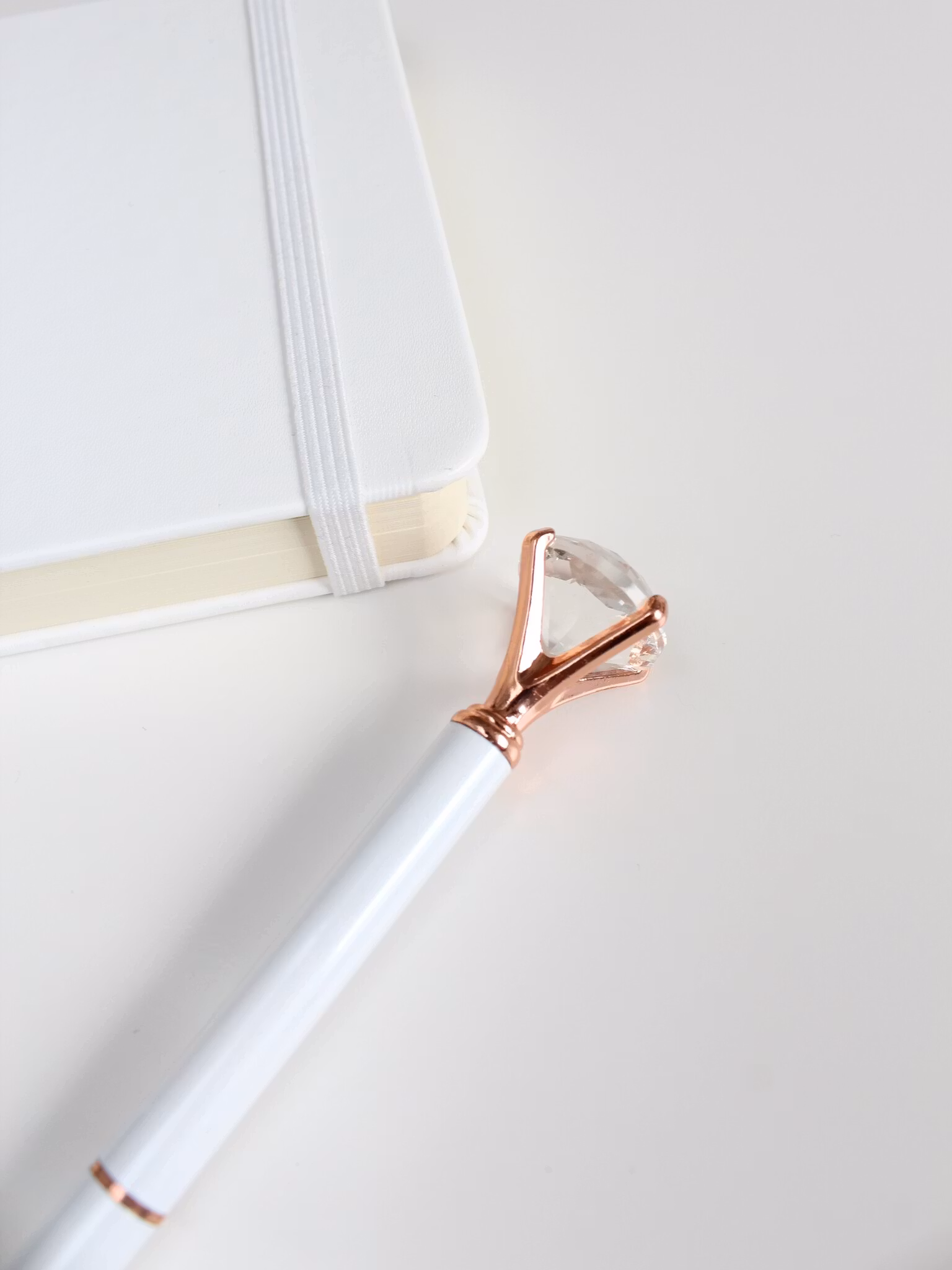 Lyxig vit diamantpenna med detaljer i roséguld för den som vill skriva med stil. Vrids för att få fram bläckspetsen. Perfekt gåva till den nyexaminerade, till maid of honor/bridesmaids eller till den blivande bruden att anteckna viktiga anteckningar inför bröllopet.