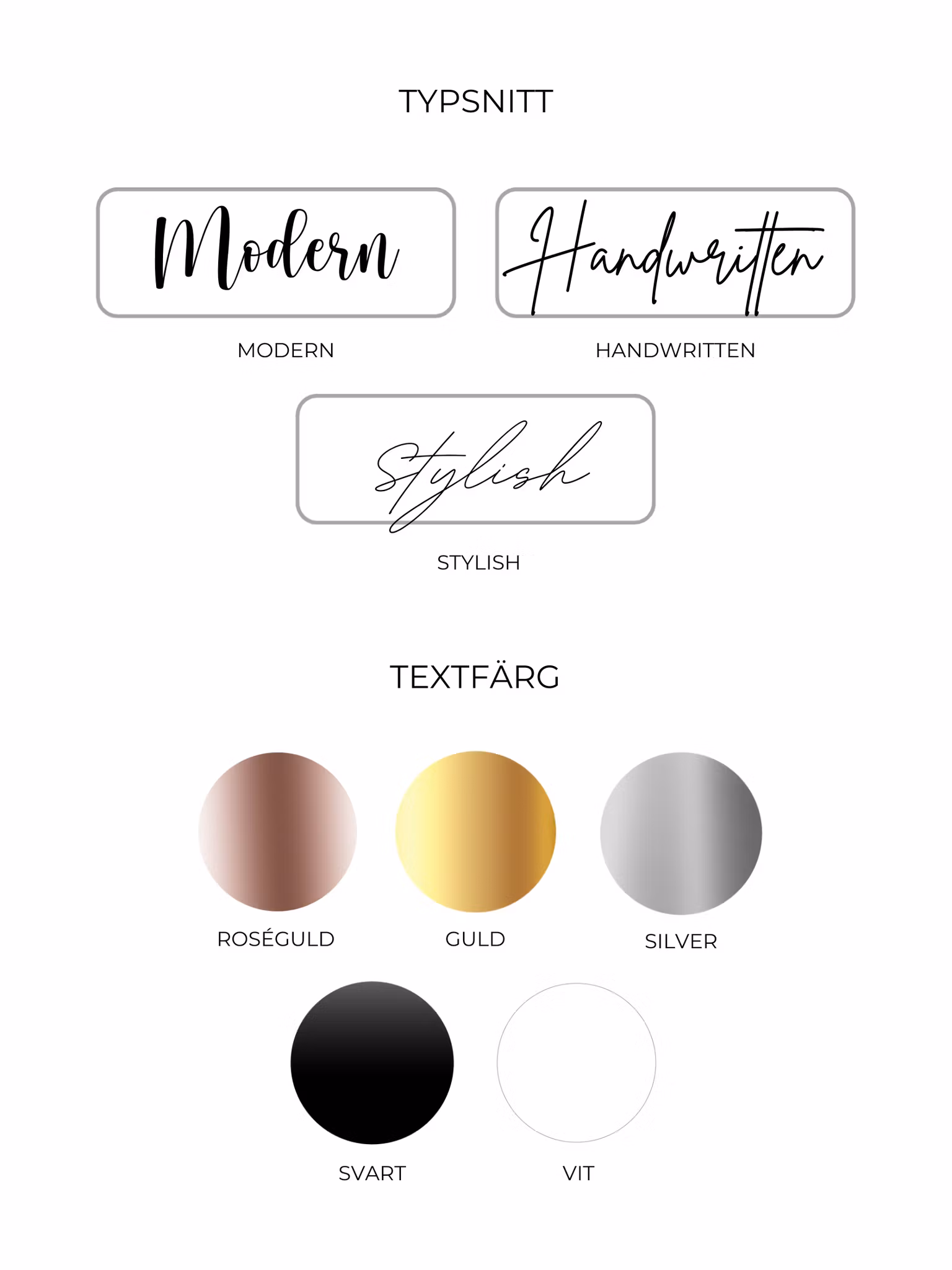Vill du skräddarsy denna produkt utöver våra standardval kan du kontakta oss så löser vi det! Vill du se en förhandsvisning av namnen i ditt valda typsnitt kan du skriva det i meddelanderutan i kassan så mailar vi en förhandsvisning innan tryck.