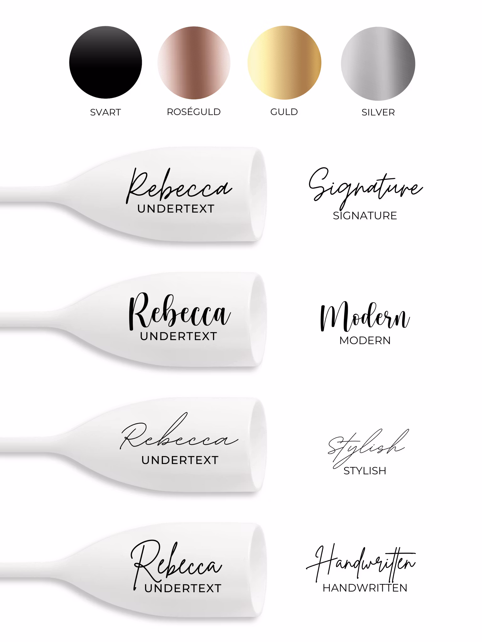 Text ingår i valfritt typsnitt och färg. Förslagsvis ett namntryck och en titel t ex. Birthday Girl, Bridesmaid/Brudtärna, Maid Of Honor, Bride To Be eller Team Bride. Välj typsnitt på övertexten. Undertexten trycks i i versaler och i vårt standardtypsnitt. Undertexten är valfri, lämnas rutan tom trycks enbart namnet/övertexten.