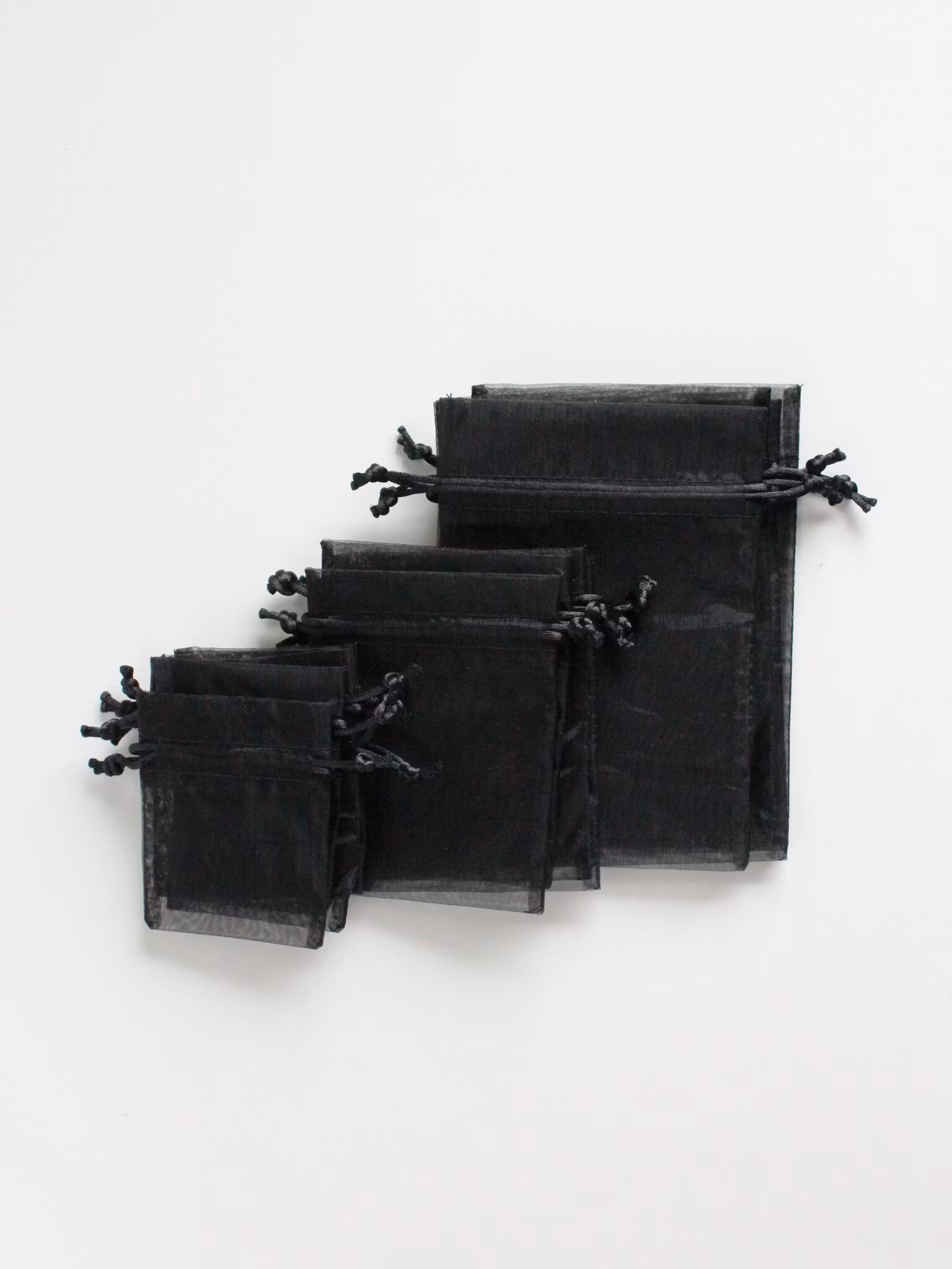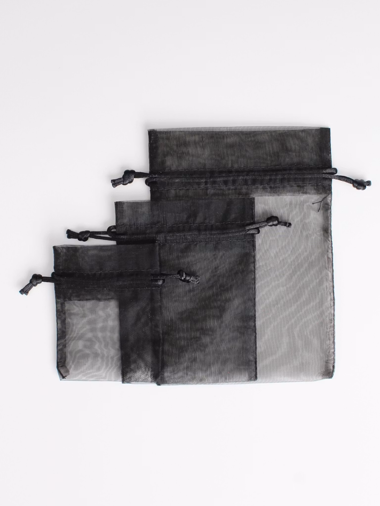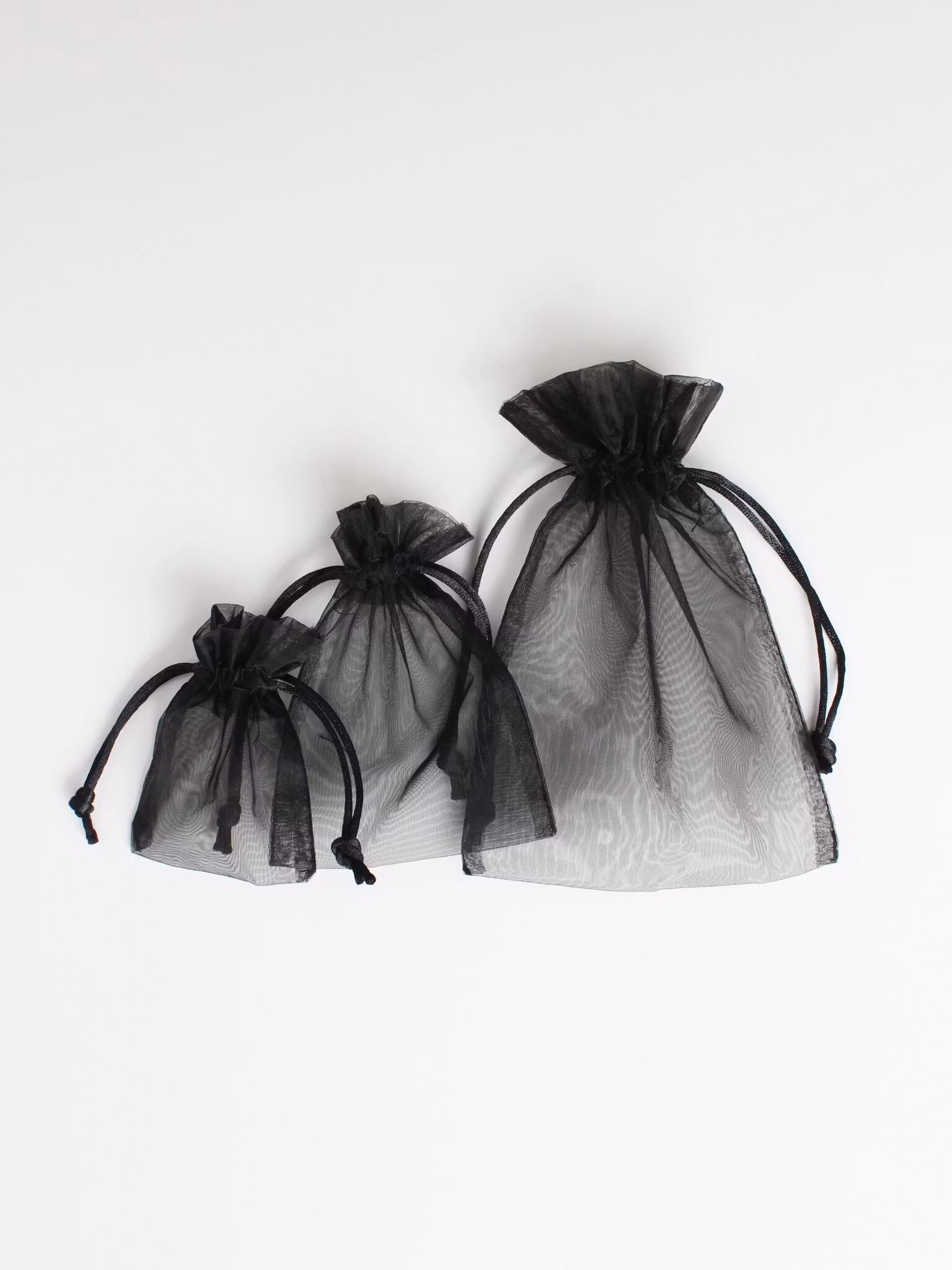 Storpack svarta organzapåsar av hög kvalitet som finns i tre olika storlekar och kan köpas i 10-pack eller 20-pack. Påsarna dras ihop med ett tvinnat sidenband. Perfekt att slå in mindre saker så som smycken, klockor och nagellack. Organzapåsar är genomskinliga och ger ett lyxigt utseende till en exklusiv produkt.