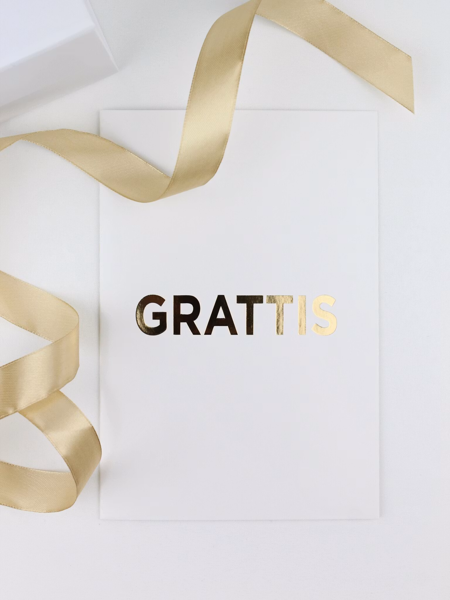 Vitt gratulationskort med texten Grattis i guld. Text går att skrivas på insidan av kortet.