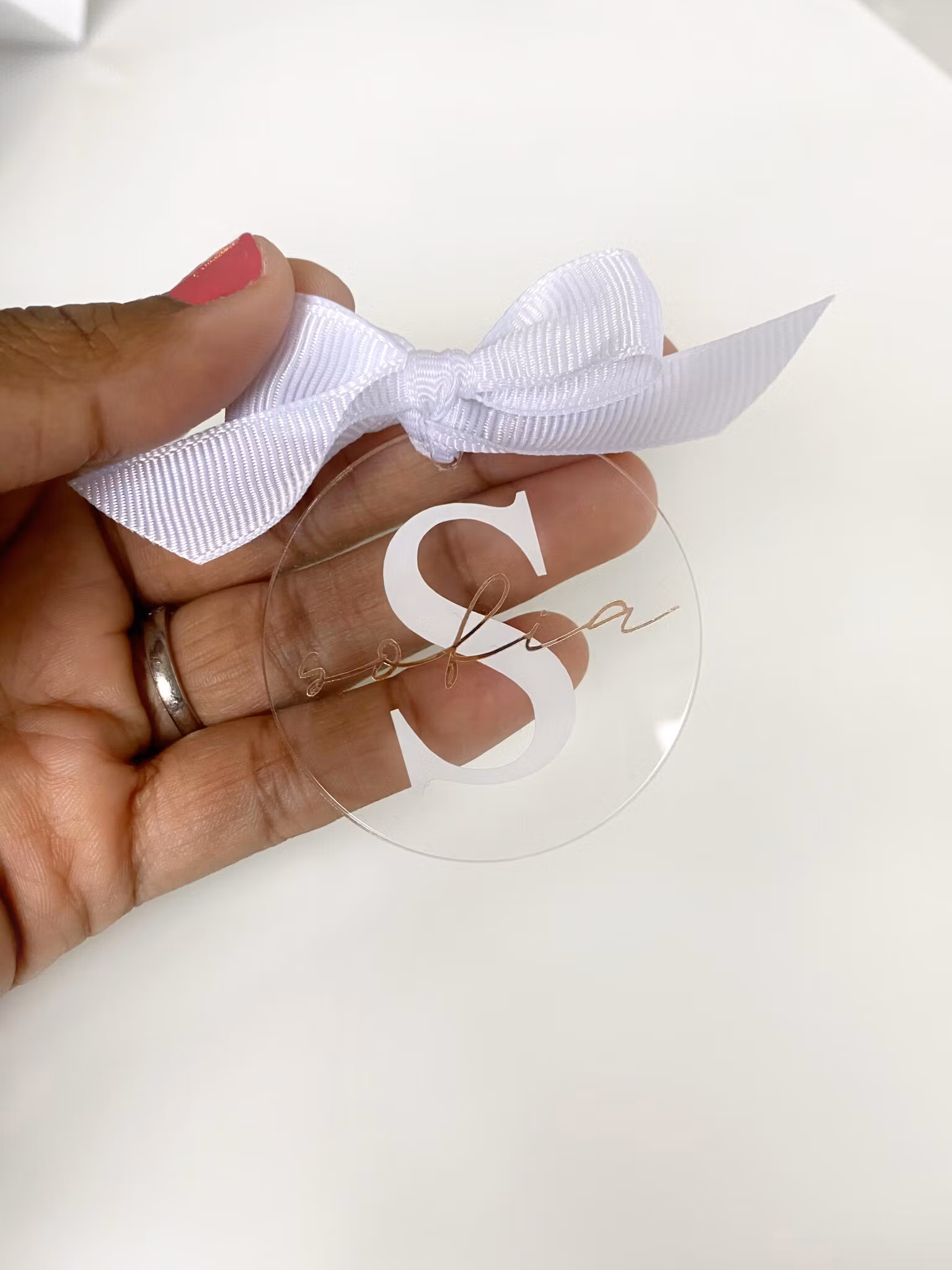 Hängetikett i transparent akryl med namntryck. Gör ditt paket extra personligt med en namnetikett eller använd som bordsplacering, nyckelring eller annat kreativt. Du kan välja mellan olika färger på både bokstav och namn. Vi rekommenderar inte att man väljer samma färg på både bokstav och namn då det blir snyggast om texterna är i olika färg.