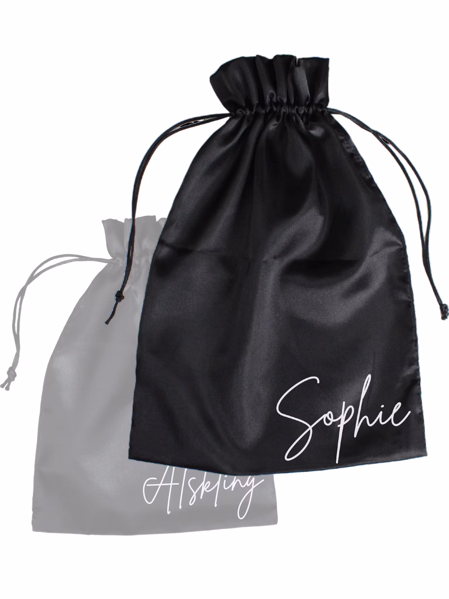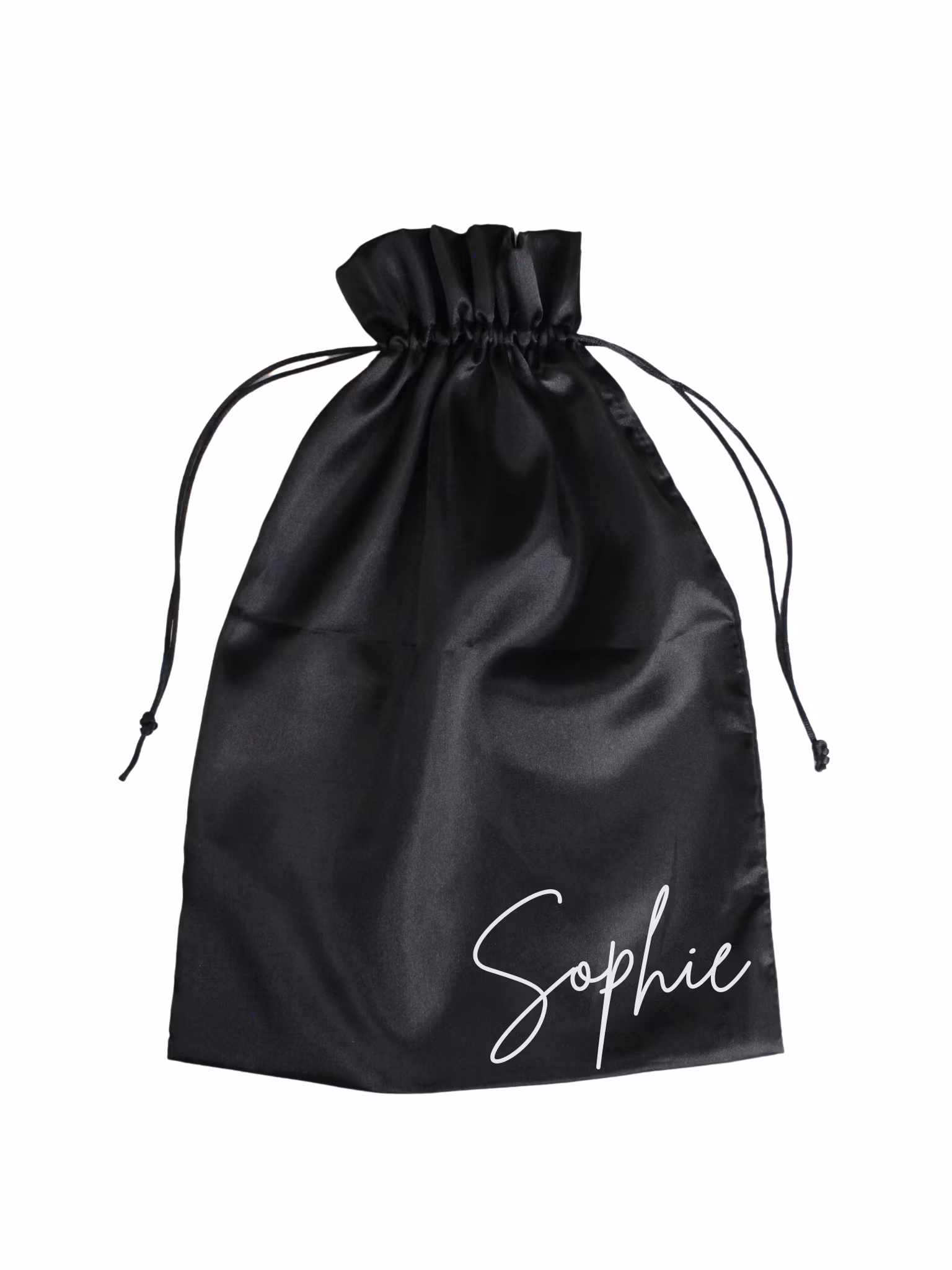Svart satinpåse i storlek Large med texttryck. Med en påse i satin kan du skapa överraskningsmoment och öka lyxkänslan när man öppnar presentboxen. Fungerar även bra att slå in produkter som är känsliga mot damm, smuts och repor. Passar våra större presentboxar så som Large och A4 Large.