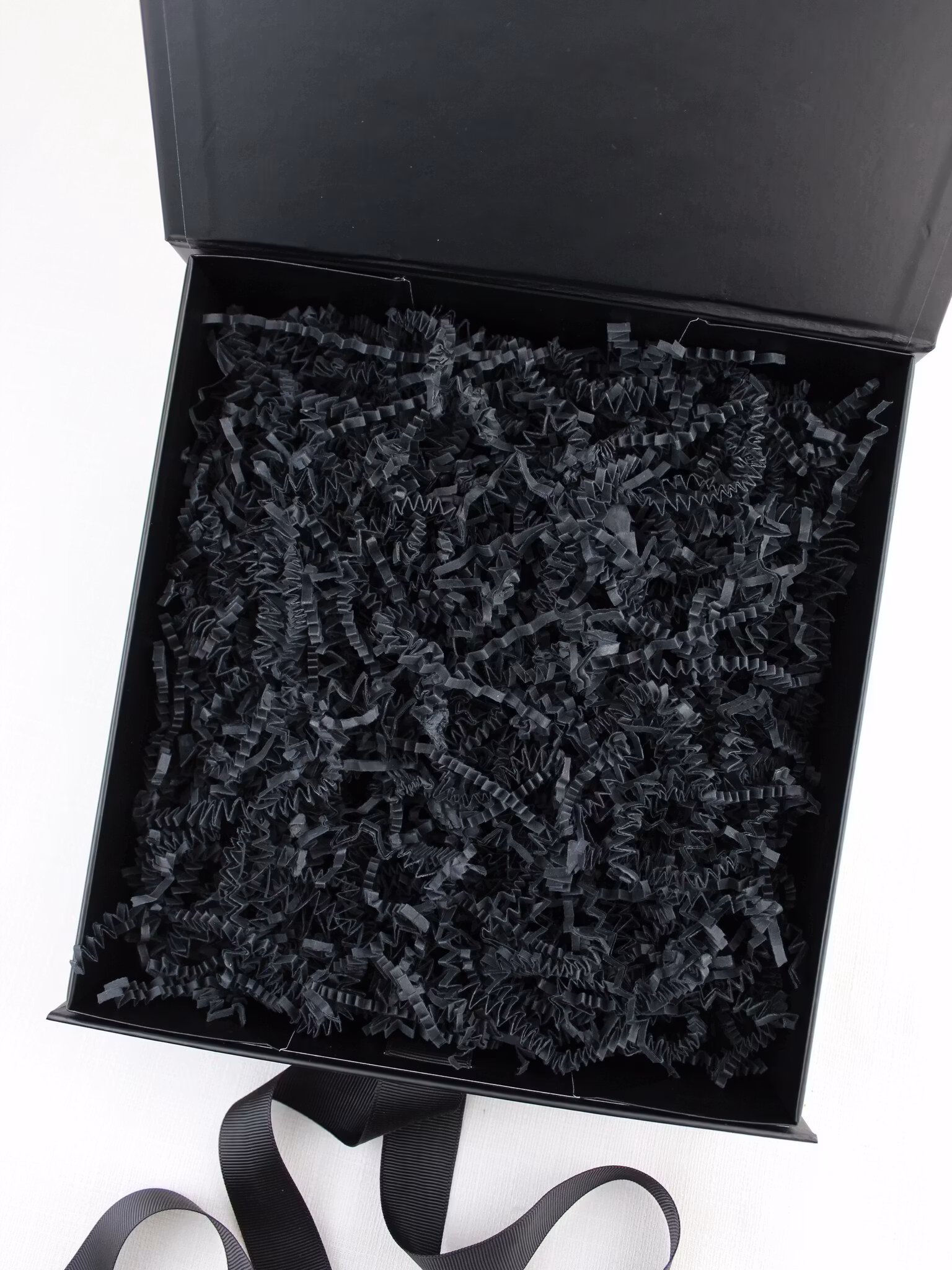 Strimlat svart papper. Används som dekorativt fyllnadsmaterial för presentinslagning. Det svarta pappret ger en mörk bakgrund till de produkter du förpackar och skyddar även mot stötar. Du kan enkelt packa flera saker i en box utan att behöva oroa dig över att sakerna åker runt i boxen.